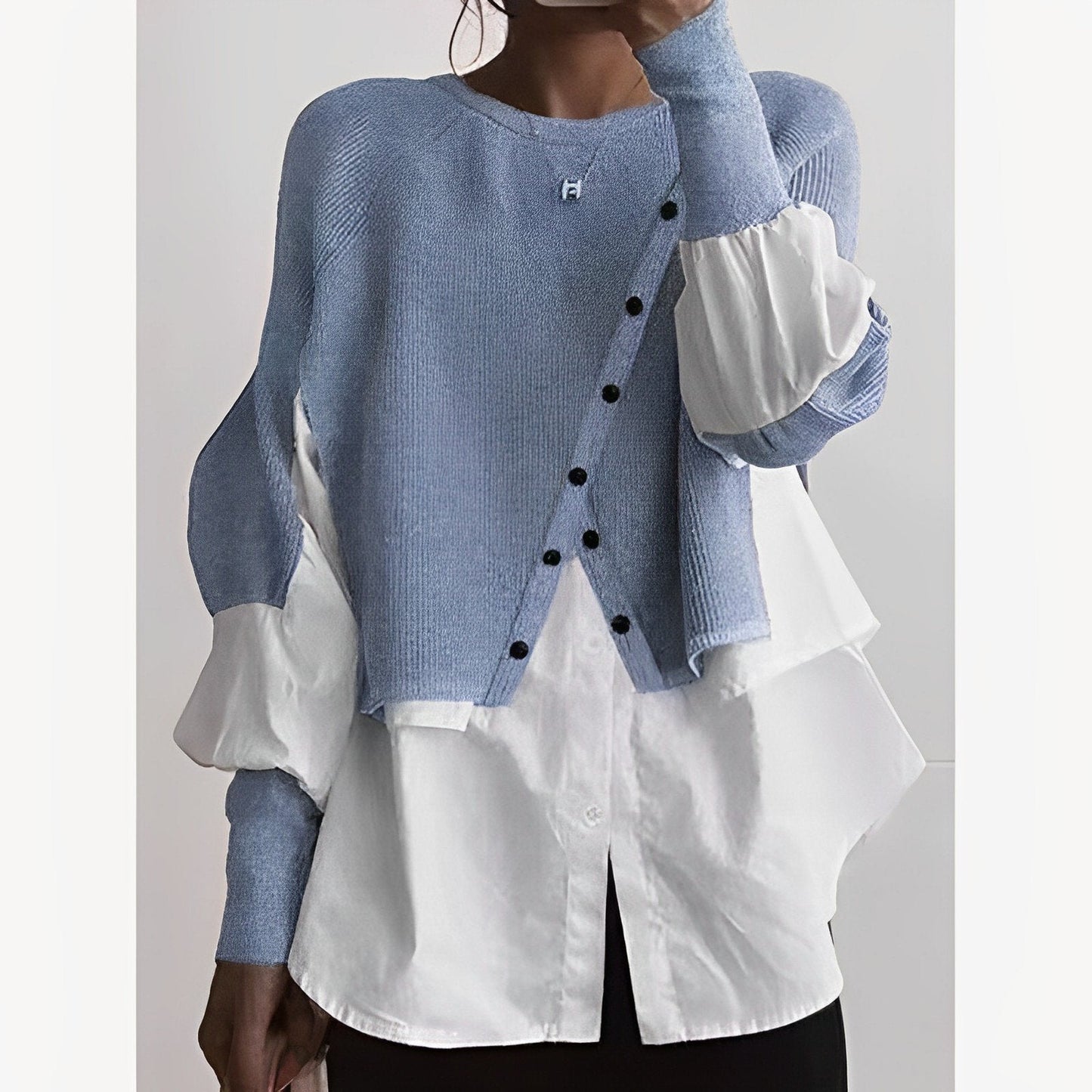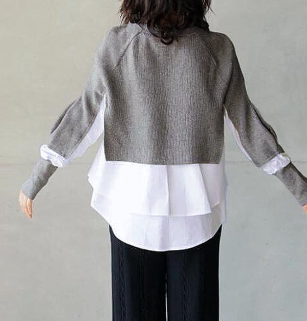Two looks in one with our super-chic twofer sweater. A gray knitted short sweater and white blouse two-in-one design give it a layered style, perfect for wearing to work or on colder days. A faux button front adds luxe detail, always making it a statement in contemporary trends anywhere you go. Machine wash normal with light colors or hand wash. May be hung up to dry or lay flat. Light ironing if needed.