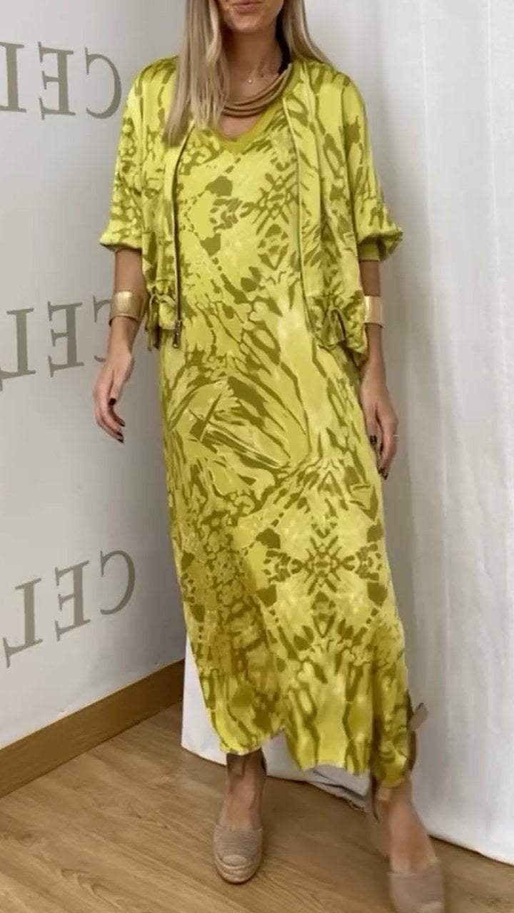 The printed dress features a trendy pattern, while the lightweight jacket adds an extra layer of elegance and warmth.