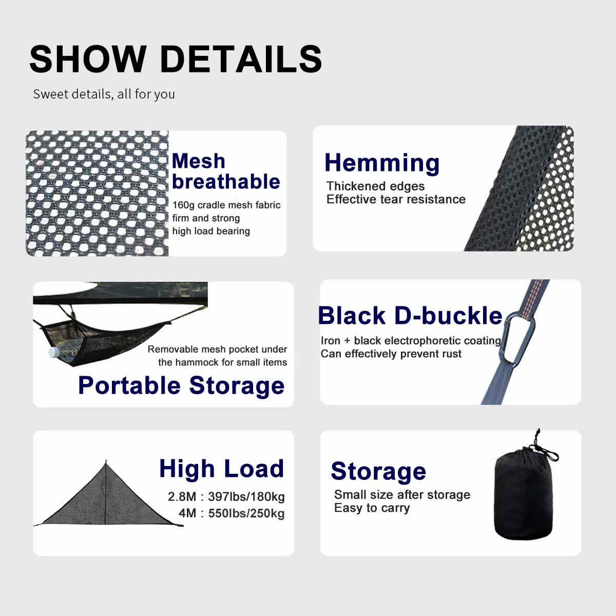 With a 500kg/1100lbs weight capacity, the Aerial Camping Hammock is designed to hold 4 adults and their gear or 2 adults and 4 children making it perfect for family adventures or group camping.